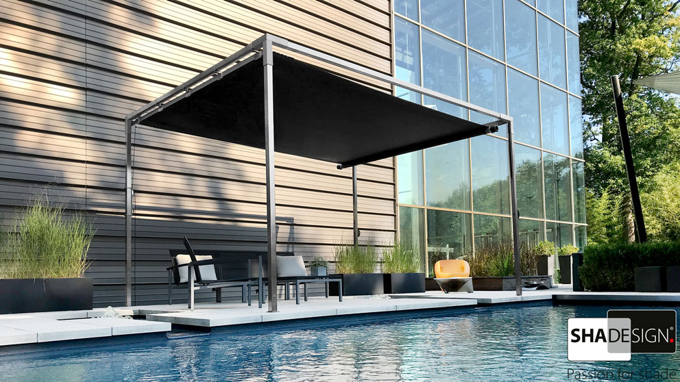 Das SHADE verbindet die elegante und leichte Ausführung eines Sonnensegels mit den Vorteilen eines aufwendigen Markisensystems.